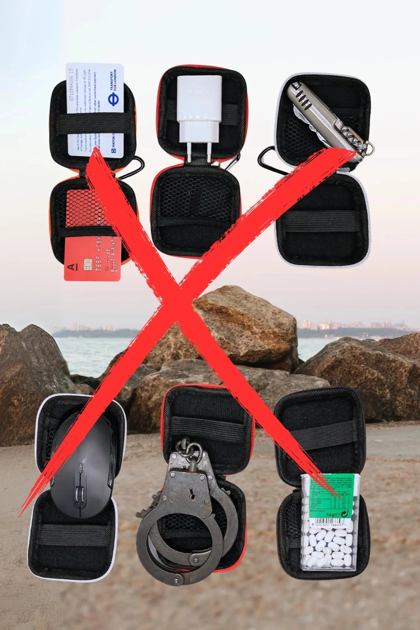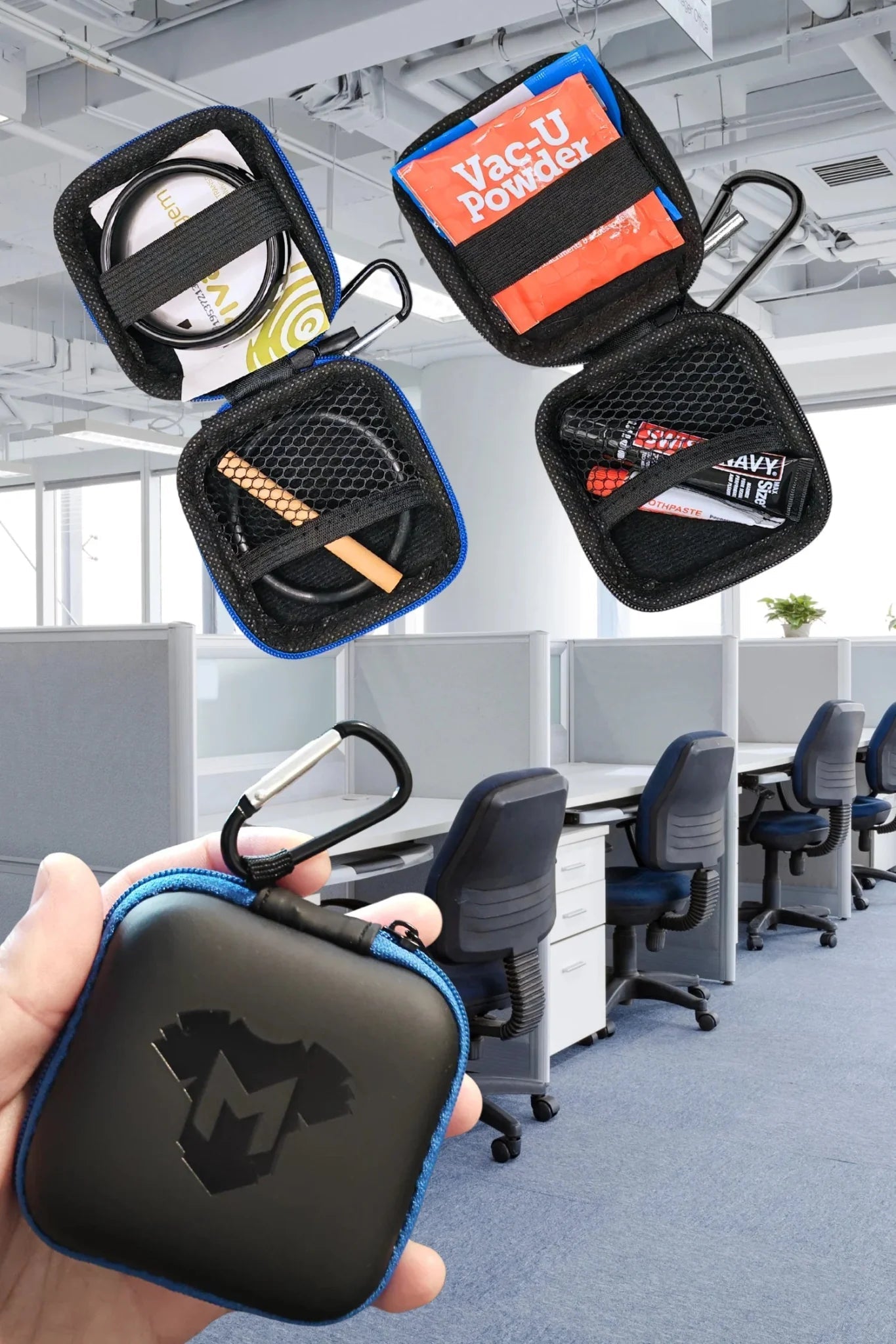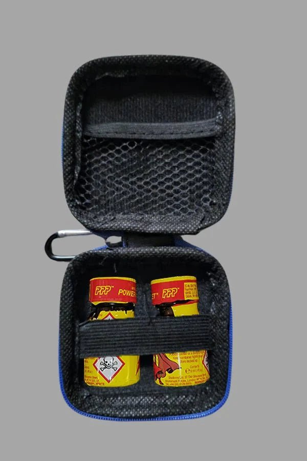 Carabiner EVA mini-case (8x8 cm, 3x3 in) with zipper. Stylish debossed Maskulo logo. Material: EVA, Ethylene-vinyl acetate, also known as poly, covered with soft-touch leather-look black matte PU (polyurethane). The case is easy to attach inside a backpack or to any jeans loop, jacket ring etc. Inside it has enough space to contain 2 "Brown bottles" (poppers). Can contain Maskulo cock rings of any size (inner diameter 40 to 55 mm, or 1.5-2.2 in.) - 1, 2 or even 3, depending on the design.