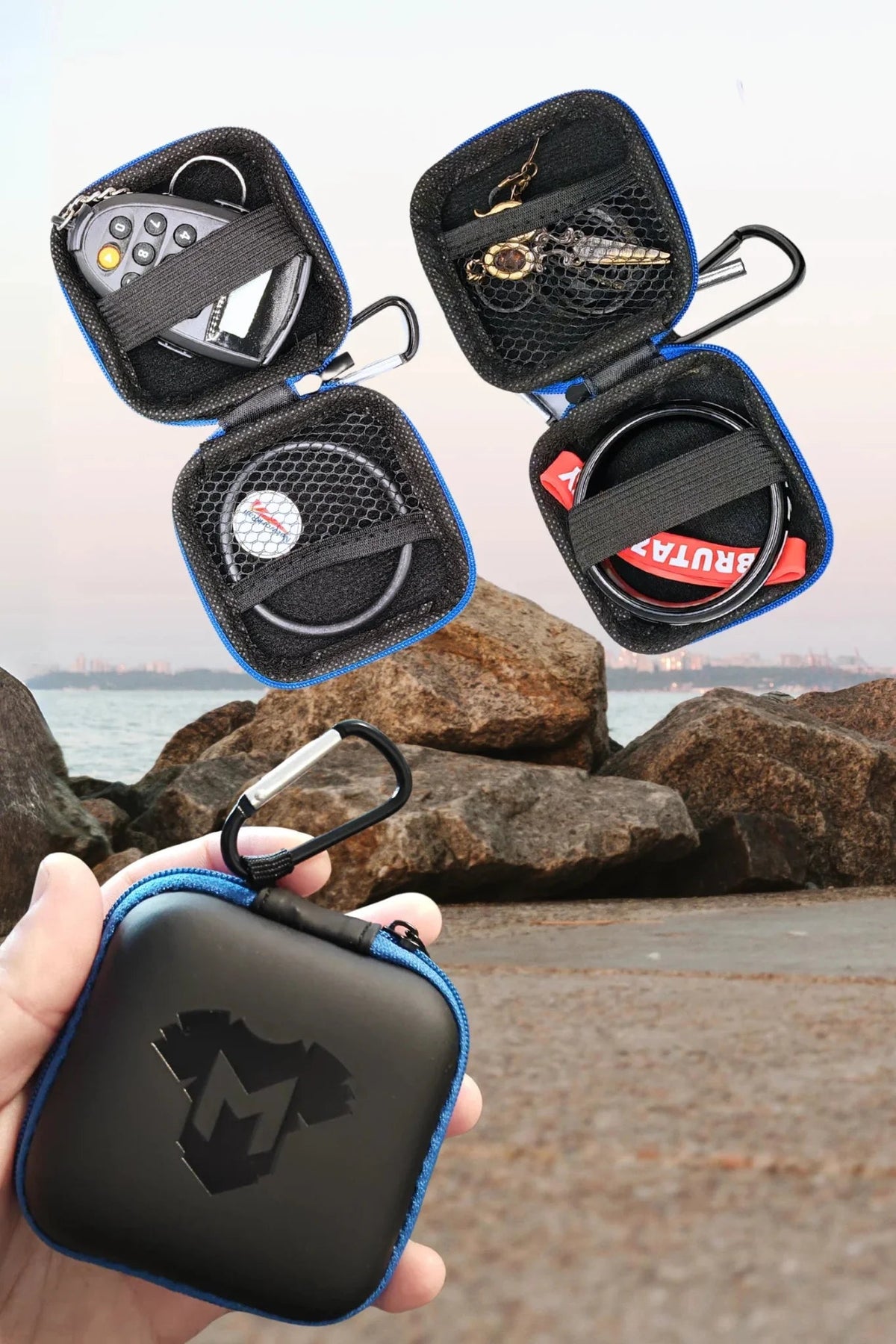 Jax Wanderlust. Mini Zip-Case with Carabiner. Black + Blue Royal