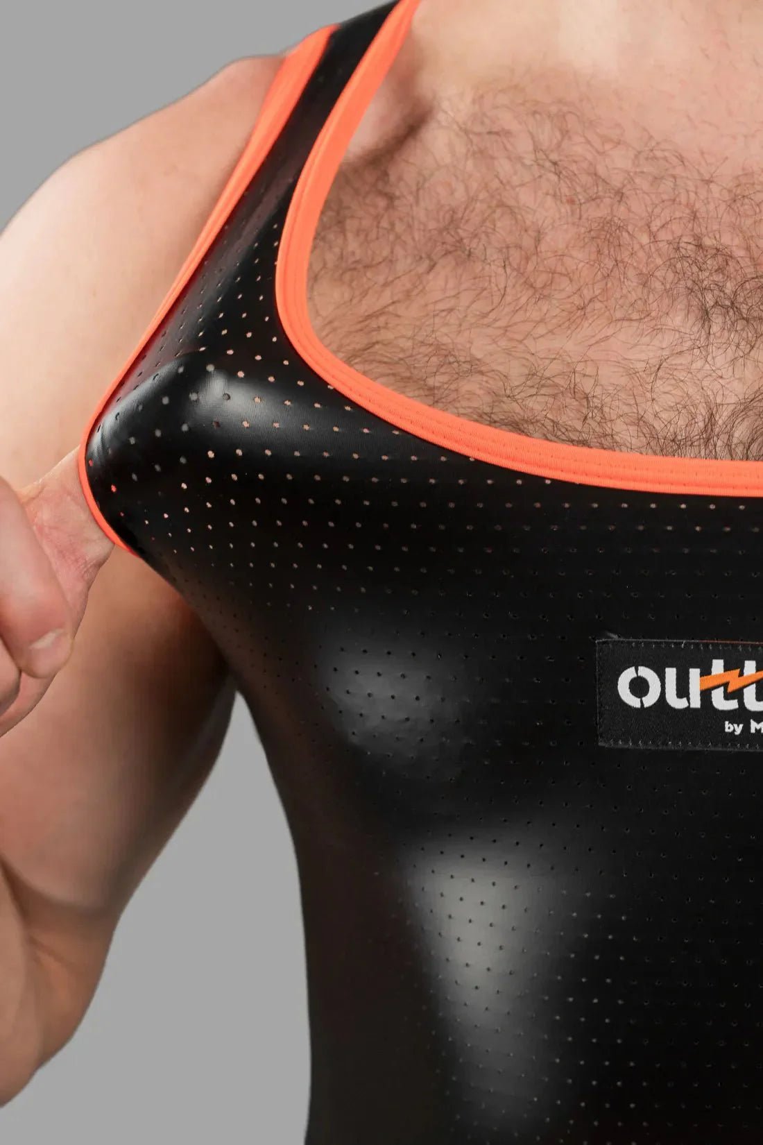 The Outtox Top in Black & Orange is crafted from a blend of polyester 85%, polyurethane 10%, and elastane 5%. This tight fit top features perforated PU eco leather, a stretchable material that ensures comfort and flexibility. The design is completed with a distinctive PVC logo on the chest.